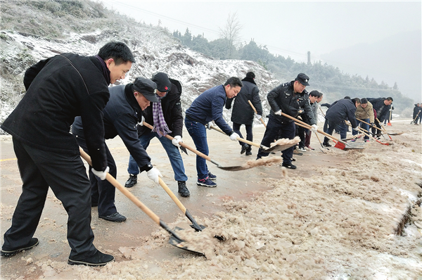 1月27日上午,鶴城區(qū)黃金坳鎮(zhèn)在職黨員干部50余人,來到209國道黃金坳鎮(zhèn)仇家村路段對冰凍路面進(jìn)行鏟雪破冰,保障來往車輛及群眾安全通行。(本報(bào)記者 史琴 通訊員 肖鵬 攝)