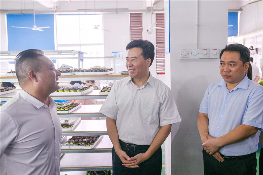9月12日上午,市委副書記、市長黎春秋在鶴城區(qū)調研企業(yè)穩(wěn)崗擴崗促就業(yè)工作。圖為黎春秋在懷化海紅盛電子科技有限公司調研。(懷化日報全媒體記者 潘雨 攝)