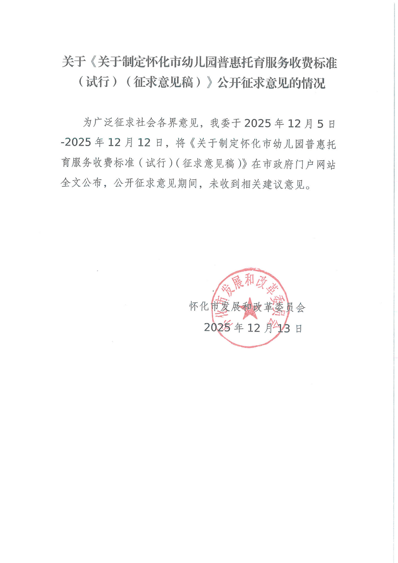 關(guān)于《關(guān)于制定懷化市幼兒園普惠托育服務(wù)收費(fèi)標(biāo)準(zhǔn)(試行)(征求意見(jiàn)稿)》公開征求意見(jiàn)的情況