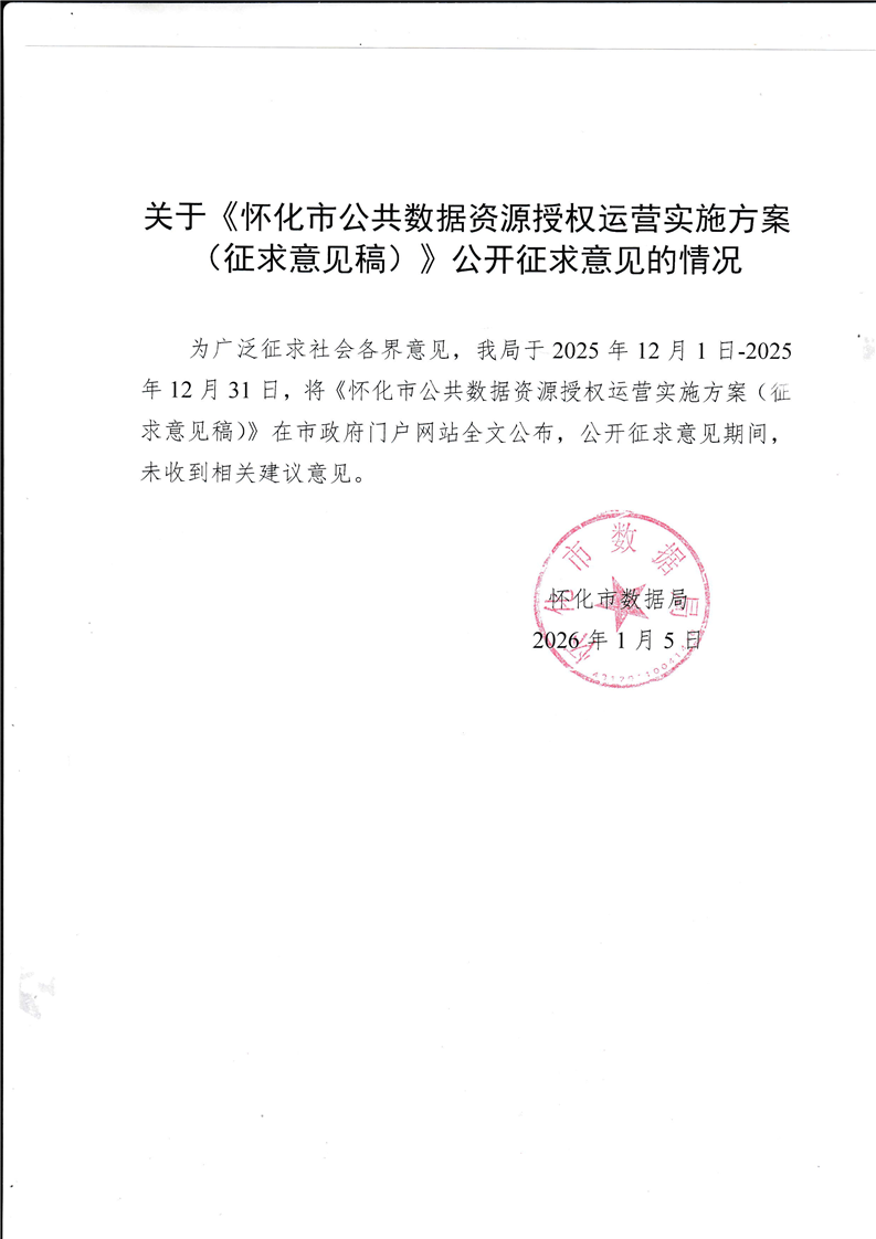 關(guān)于《懷化市公共數(shù)據(jù)資源授權(quán)運(yùn)營實(shí)施方案(征求意見稿)》公開征求意見的情況