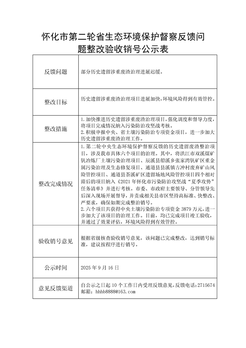 懷化市第二輪省生態(tài)環(huán)境保護督察反饋問題整改驗收銷號公示