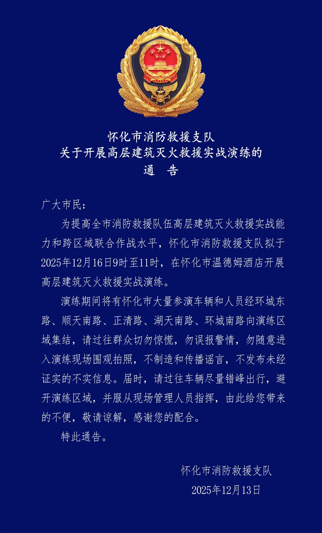 懷化市消防救援支隊(duì)關(guān)于開展高層建筑滅火救援實(shí)戰(zhàn)演練的通告
