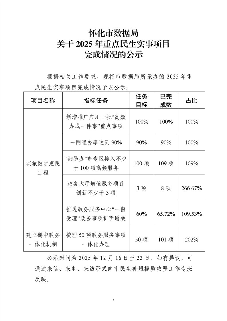 懷化市數(shù)據(jù)局關(guān)于2025年重點民生實事項目完成情況的公示